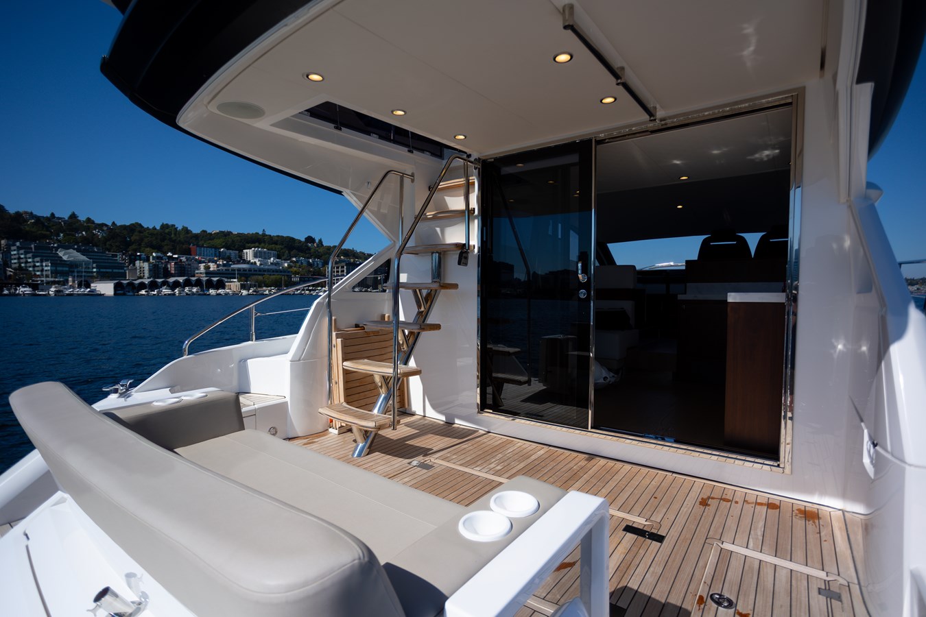 The aft cockpit is a wonderful lounge space with a built in sofa with storage below, teak decking and a stowable teak table that affords dining as well as a large open deck when desired. Wing gates provide security for children or pets from going down the swim platform. A seamless transition to the main salon with telescoping doors gives a wonderful indoor-outdoor feel. Included as well is a full cockpit canvas enclosure for when it gets wet or cold outside.